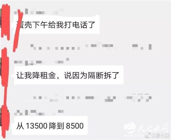 一张流传于网络的截图显示,某位蛋壳公寓的房东称,自己的房子因“拆除隔断”而被蛋壳要求大幅降低租金,“从13500元/月锐减至8500元/月”。