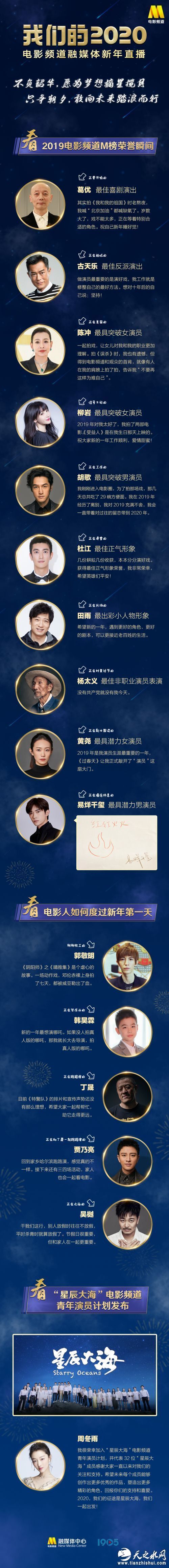 2020年1月1日,是2020年新年的第一天。在浓厚的节日氛围中,电影频道融媒体中心也为大家献上了一份厚礼——“我们的2020”电影频道融媒体新年直播活动。本次活动中,电影频道“当家花旦”蓝羽,联合著名影评人尹鸿、谭飞等,直击葛优、易烊千玺、周冬雨、古天乐、陈冲、杜江、丁晟、贾乃亮、柳岩、郭敬明、吴樾、田雨等电影人新年第一天的日常,揭晓了“电影频道M榜”10项荣誉,并首次发布了“星辰大海——电影频道青年演员计划”官方MV。