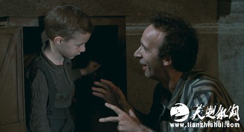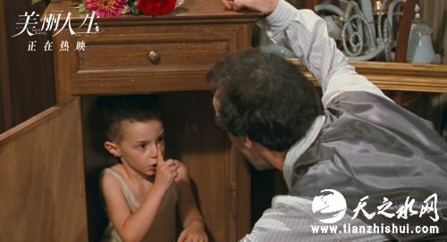 电影《美丽人生》的前半部分,展示了一个幽默诙谐、充满了勇气与美好的爱情故事。犹太青年圭多邂逅了他的公主多拉,他总是会以“早安,公主!”来问候她,想方设法让他的“公主”开心。时光一晃而过,两人有了一个可爱的儿子约书亚。可好景不长,当纳粹的黑暗势力逐渐弥漫,在约书亚5岁生日那天,父子两人被抓往集中营。为了保护孩子纯真的心灵,远离集中营的阴霾和血腥,父亲圭多选择将集中营的一切变成一场积分游戏,以下情况则会直接失分:哭闹、说要找妈妈、饿着肚子要吃点心,而谁先获得1000分,谁就能获得一辆真正的坦克。正是这个“世界上最美丽的谎言”为儿子约书亚创造了一个美丽人生,没有给他留下任何阴影。
