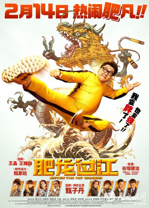 由上海博纳文化传媒有限公司、星王朝有限公司、博纳影业集团股份有限公司出品,甄子丹、王晶、王雅琳监制,谷垣健治导演的动作喜剧电影《肥龙过江》宣布定档2月14日,该片由甄子丹、毛舜筠、周励淇、王晶领衔主演,日前片方发布了“肥龙在天”版海报及定档预告,甄子丹突破体重极限变身“肥龙”,从香港打到东京,在完美诠释新角色的同时,还保留了原汁原味的“甄功夫”。