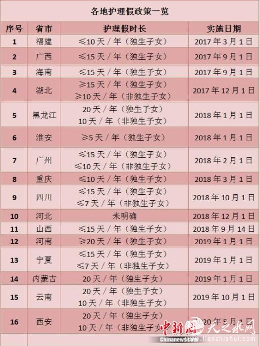 各地的护理假时长有所区别,此外,在湖北、黑龙江、四川、宁夏、广州等地还规定,非独生子女也可享受这一待遇。