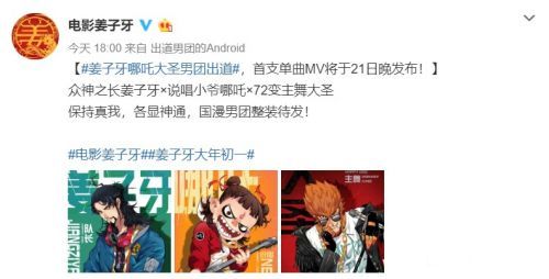 1月19日,电影《姜子牙》官微发预告,电影MV将于21日晚发布。“姜子牙哪吒大圣男团出道,首支单曲MV将于21日晚发布!众神之长姜子牙×说唱小爷哪吒×72变主舞大圣,保持真我,各显神通,国漫男团整装待发!”