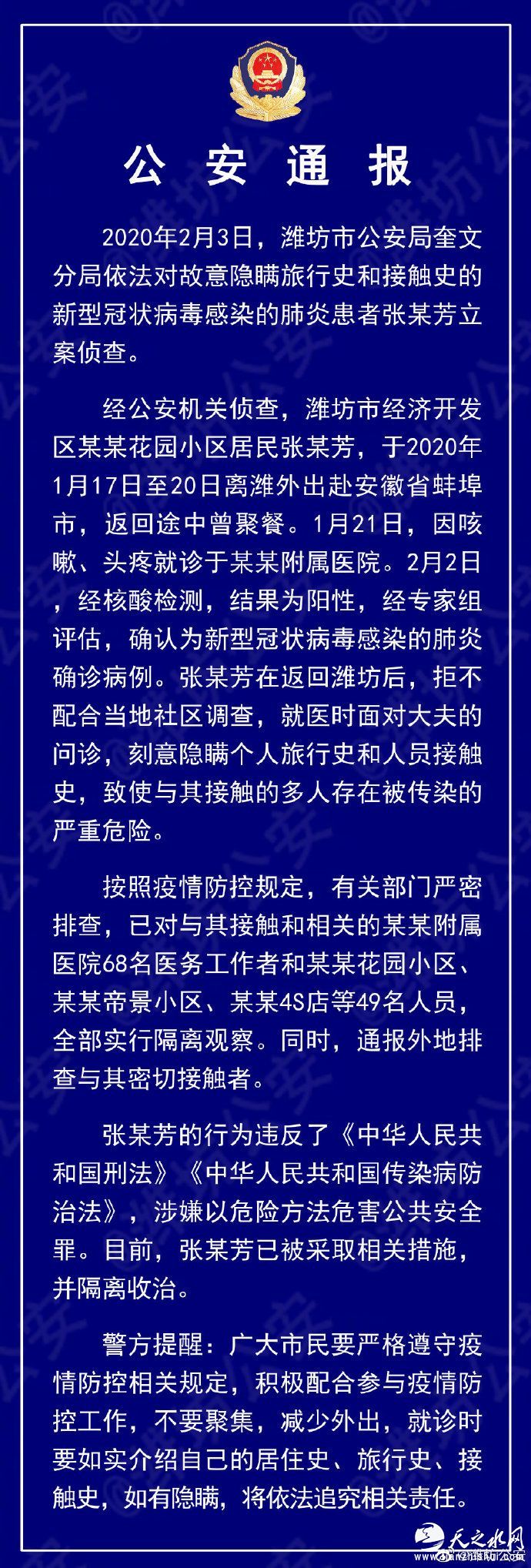 中新网2月5日电 据山东省潍坊市公安局官方微博消息,2020年2月3日,潍坊市公安局奎文分局依法对故意隐瞒旅行史和接触史的新型冠状病毒感染的肺炎患者张某芳立案侦查。