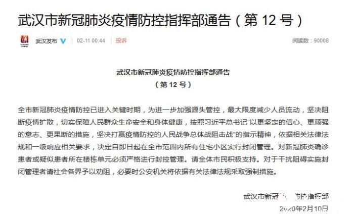 中新网2月11日电 据武汉市互联网信息办公室官方微博消息,10日,武汉市新冠肺炎疫情防控指挥部通告(第12号)发布。指出,决定自即日起在全市范围内所有住宅小区实行封闭管理。对新冠肺炎确诊患者或疑似患者所在楼栋单元必须严格进行封控管理。