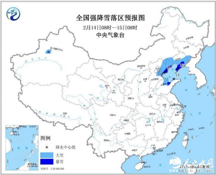 预计,2月14日8时至15日8时,内蒙古东南部、河北东部、北京东部、天津、山东北部、辽宁东部和西南部、吉林东南部等地的部分地区有大雪,其中,河北东北部、辽宁东部、山东北部等局地有暴雪(10~16毫米);上述地区新增积雪深度一般有4~6厘米,局地可达10~16厘米。