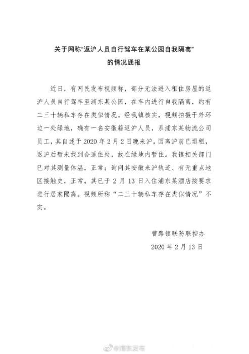 据上海市浦东新区政府新闻办微博消息,近日,有网民发布视频称,有返沪人员自行驾车在某公园自我隔离。浦东新区曹路镇联防联控办就此事发布通报称,经查,确有一名安徽籍返沪人员在外环边一处绿地内暂住,其体温正常,目前已入住浦东某酒店按要求进行居家隔离。视频所称“二三十辆私车存在类似情况”不实。