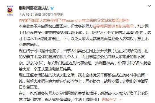 近日,有男子在网上称自己通过“当官的”父亲关系,从天门回到荆州,引发争议。对此,荆州市公安局网络安全保卫支队官方微博15日刊文回应称,当事人已在网上公开致歉,有关部门正在对此事做进一步调查核实,“相信用不了多久就会给大家一个正式回应和处理结果。”