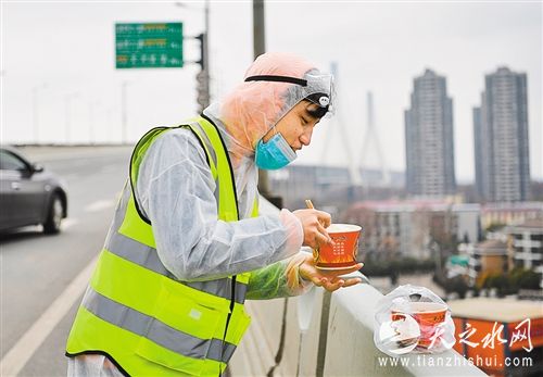 2月8日,武汉市青山区天兴洲长江大桥检查点,余靖以护栏当桌,简单吃顿午饭。