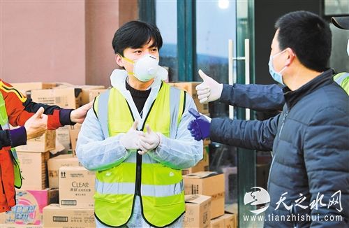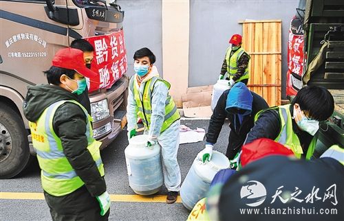 2月8日,武汉市青山区八吉府街道,余靖(左二)和志愿者们一起搬运贵州省援助武汉一线抗“疫”人员的生活物资。