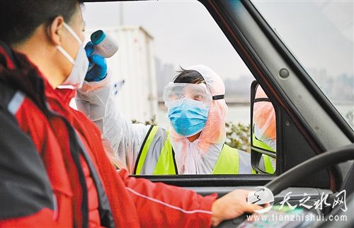2月8日,武汉市青山区天兴洲长江大桥检查点,余靖在给运输物资的司机测量体温。