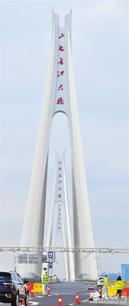 2月13日,余靖(左一)来到武汉市武昌区二七长江大桥检查点,开始志愿服务。