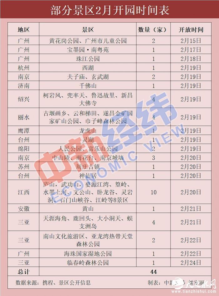 近期,陆续有景区“开门”迎客。据中新经纬客户端不完全统计,广州珠江公园、杭州西湖、济南千佛山、绍兴鲁迅故里、南京中山陵等44家知名景区已于2月开园,另外还有一批景区将陆续开放。