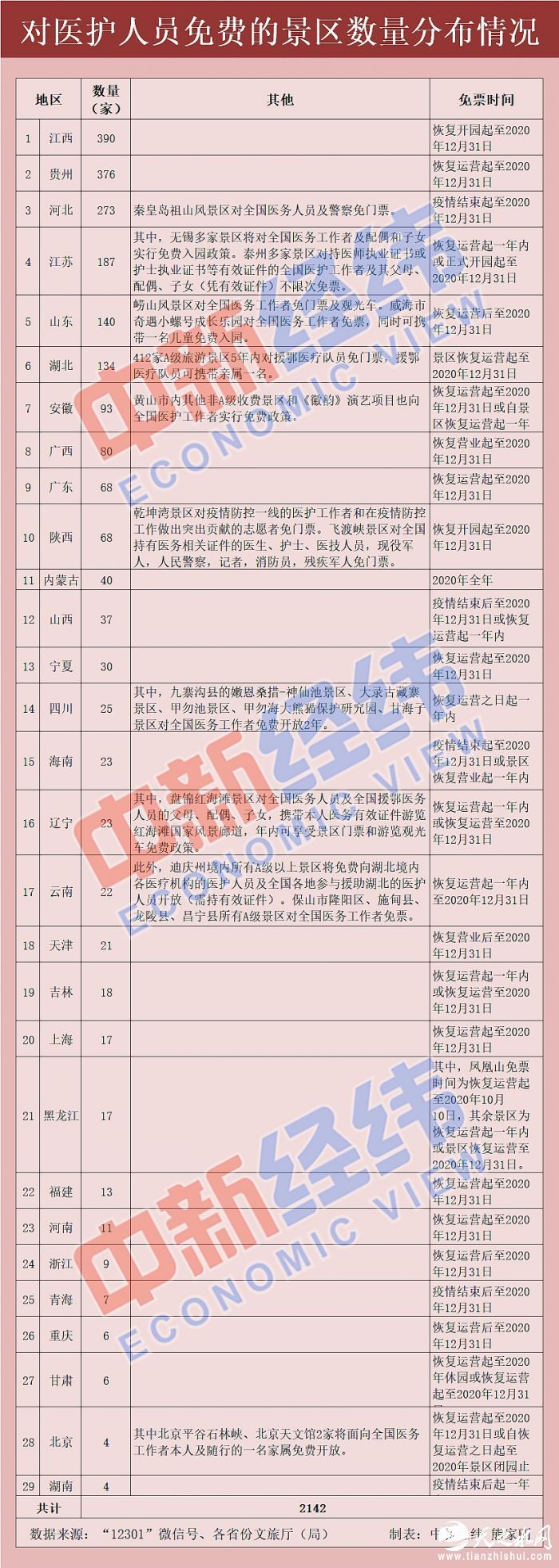 据中新经纬客户端不完全统计,截至2月23日,实施医护人员免票的景区至少达到2142个,覆盖江西、贵州、河北、江苏、山东等29个省份,涵盖了名胜古迹、自然风光、主题乐园、展馆展览等多个种类。