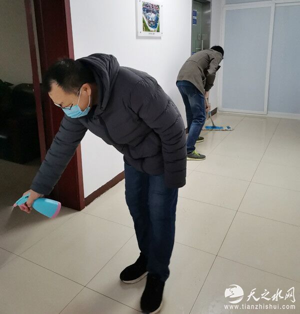 分公司严格落实防控措施,组织职工一起对机关办公区域进行清洁和消杀。办公室门窗打开,保证每半小时通风一次;用喷壶把稀释的84消毒液每一小时对门厅把手进行喷雾消毒,并用消毒水浸泡过的抹布擦拭;对门厅、楼道、饮水间、会议室、办公室各个区域每2小时进行喷雾消毒,并根据区域的不同使用专用保洁用具对地面进行清洁消毒,保证办公环境清洁;为在岗职工发放口罩、塑胶手套,保证个人防护安全。