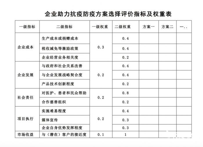 在企业掌握了抗疫防疫的各种准确信息后,就要制定助力抗疫防疫的物资生产和慈善捐赠计划,并对拟定的各种方案进行评价和筛选,最终确定最合适的方案。评价指标应具有引导性,即所选择的指标既要从抗疫防疫的需要和企业实际出发,又要考虑到政府政策支持和企业未来的发展规划。同时,还需将各项评价指标量化,使评价指标客观化,减少主观因素。在评价指标及权重的设计中,要重点考虑12项税收减免等激励政策。具体可选取5大类一级指标和12项二级指标,并根据各项指标重要度设定相应权重(供参考),具体如下表所示。