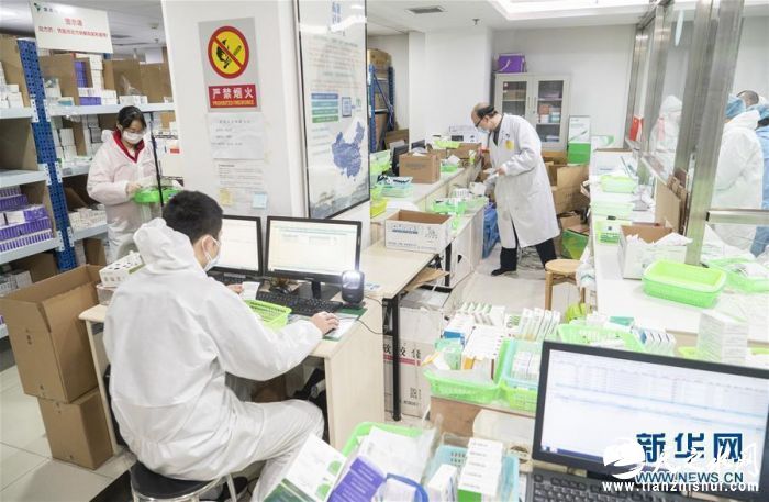 为减少交叉感染,社区工作人员来药店为社区患者开药取药采取预约制。图为 2月27日,在武汉市汉口大药房黄石路店,药房工作人员在核对取药。新华社记者 才扬 摄