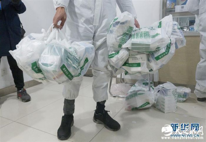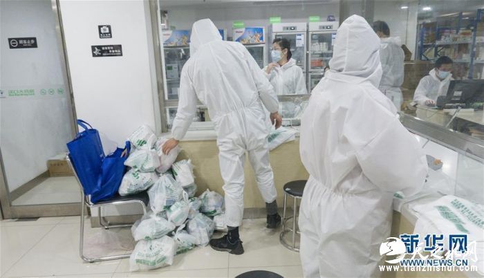 2月27日,在武汉市汉口大药房黄石路店,社区工作人员拿好药准备离开。新华社记者 才扬 摄