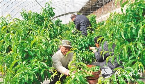 图为马营乡五保户郭义正在赤城煜园农业生态科技产业园日光温室大棚里对春桃进行疏果管理。 姜雪娟摄(中经视觉)