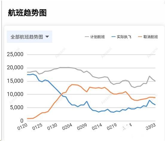 疫情期间全国航班数据统计,可见执飞航班呈断崖式下降