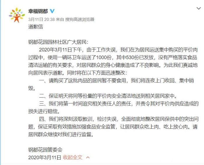 就网友曝光“武汉市青山区钢都花园用环卫车运送平价肉”一事,钢都花园管委会11日晚通过微博道歉,表示将上门收回平价肉集中销毁并追责。
