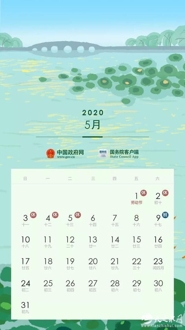劳动节:5月1日至5日放假调休,共5天。4月26日(星期日)、5月9日(星期六)上班。