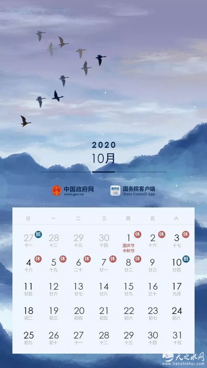 国庆节、中秋节:10月1日至8日放假调休,共8天。9月27日(星期日)、10月10日(星期六)上班。