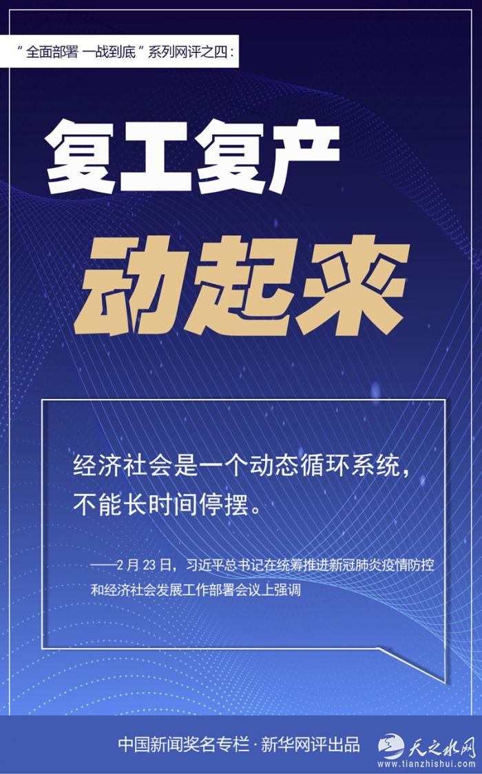 疫情下的复工复产是一场特殊时期的特殊战役,等不得、拖不得,但也急躁不得。既要统筹兼顾、精准施策,也要有序推进、稳扎稳打。要紧跟疫情防控的新进展、新形势,因时施策,因势而动,稳妥推进复工复产;要实施分区分级精准防控策略,打通人流、物流堵点,给企业复工复产多清障、少设障、善保障;要从实际出发、从细处着手,务求实效,把支持复工复产的各项工作做细做扎实,不断推动复工复产走深走实。(文字:董璐 海报制作:张倩)