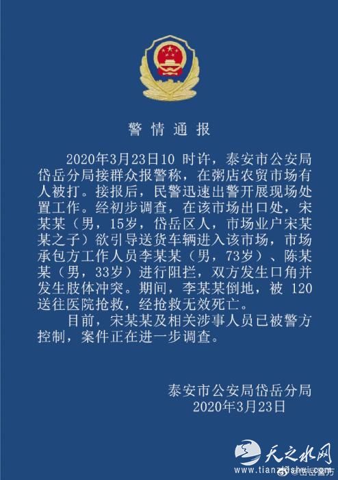 通报指出,3月23日10时许,泰安市公安局岱岳分局接群众报警称,在粥店农贸市场有人被打。
