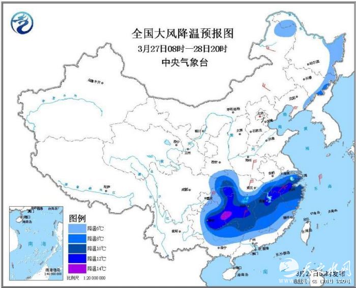 受较强冷空气影响,27日08时至28日20时,内蒙古中东部、华北北部、东北地区、黄淮南部、江淮、江汉、江南、华南中北部等地先后有4~6级风,阵风7~9级,东北的地区东部、江淮南部、江汉、重庆、贵州中东部、江南、华南中北部等地的部分地区日平均气温或最低气温下降6~10℃,其中,湖北西南部、湖南中西部、贵州东南部、安徽南部、江西北部、浙江西北部等地的部分地区降温可达12℃以上。