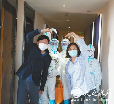在丽枫康复驿站隔离区,即将出站的康复者与医护人员合影。本报记者 申少铁摄