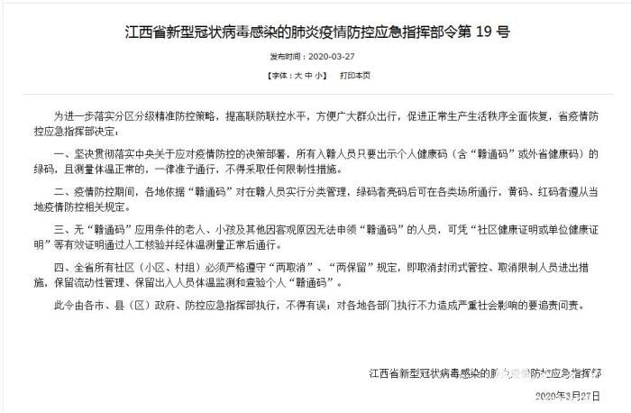 通告明确,全省所有社区(小区、村组)必须严格遵守“两取消”、“两保留”规定,即取消封闭式管控、取消限制人员进出措施,保留流动性管理、保留岀入人员体温监测和查验个人“赣通码”。