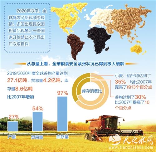 从全球粮食供求形势看,2019/2020年度全球谷物产量达到27.1亿吨,贸易量4.2亿吨,库存量8.6亿吨,分别比2007年增加了27%、54%和97%;谷物库存消费比达到30%,比2007年提高了10个百分点,小麦、稻谷的库存消费比均达到了35%,均比2007年提高了约13个百分点。从总量上看,全球粮食安全紧张状况已得到极大缓解。这其中包括中国粮食大幅度增产、库存增加,以及大规模脱贫对全球粮食安全作出的贡献。