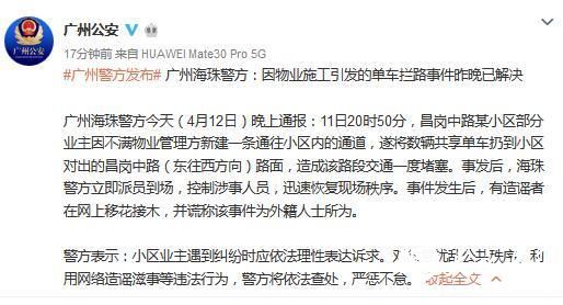 中新网4月13日电 据广州市公安局官方微博消息,广州海珠警方12日晚上通报称,11日20时50分,昌岗中路某小区部分业主因不满物业管理方新建一条通往小区内的通道,遂将数辆共享单车扔到小区对出的昌岗中路(东往西方向)路面,造成该路段交通一度堵塞。事发后,海珠警方立即派员到场,控制涉事人员,迅速恢复现场秩序。事件发生后,有造谣者在网上移花接木,并谎称该事件为外籍人士所为。