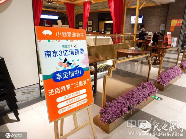 3月18日,南京市建邺区一家饭店在门前摆出欢迎使用消费券的广告牌。(图片来源:东方IC)