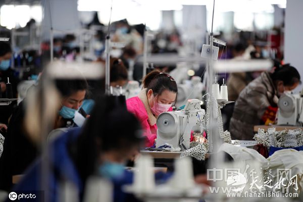 3月3日,江苏泗洪经济开发区一家服装企业的生产车间里,工人正在紧张忙碌。(图片来源:东方IC)