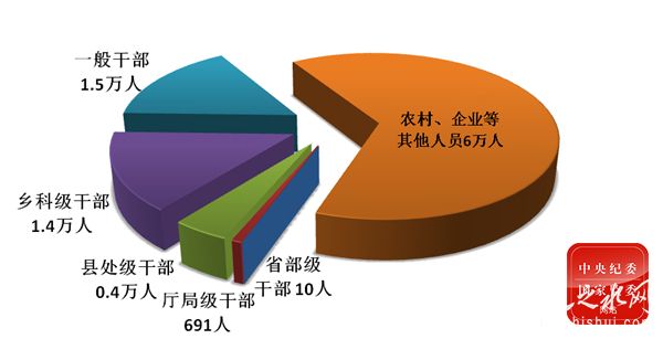 2020年第一季度,全国纪检监察机关共接收信访举报62万件次,处置问题线索32.7万件,谈话函询7.4万件次,立案10.4万件,处分9.3万人(其中党纪处分8万人)。处分省部级干部10人,厅局级干部691人,县处级干部0.4万人,乡科级干部1.4万人,一般干部1.5万人,农村、企业等其他人员6万人。