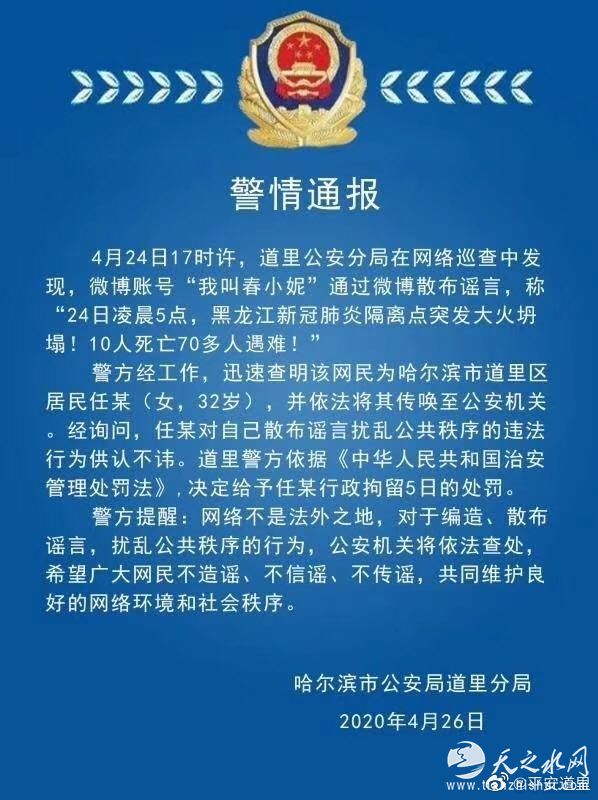 中新网4月27日电 据黑龙江省哈尔滨市公安局道里分局官方微博消息,4月24日17时许,哈尔滨市道里公安分局在网络巡查中发现,微博账号“我叫春小妮”通过微博散布谣言,称“24日凌晨5点,黑龙江新冠肺炎隔离点突发大火坍塌!10人死亡70多人遇难!”