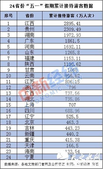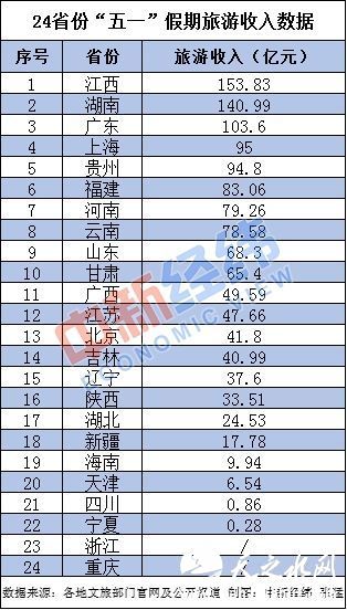 分省份来看,中新经纬客户端梳理发现,已经公布旅游数据的24个省份中,江西、湖南、广东3省份,“五一”旅游总收入均超过100亿元。其中,江西以153.83亿元位列第一,湖南140.99亿元紧随其后,广东103.6亿元排名第三。