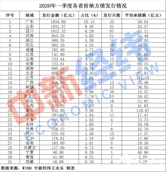 联合资信分析报告指出,一季度各地地方债发行节奏分化较为明显。2019年发行规模排名前两位的江苏和湖南,其2020年一季度的发行规模分别仅相当于2019年全年的20.37%和27.28%,低于全国36.92%的平均水平。相比之下,广东2020年一季度的发行量达到了2019年全年的71.69%。
