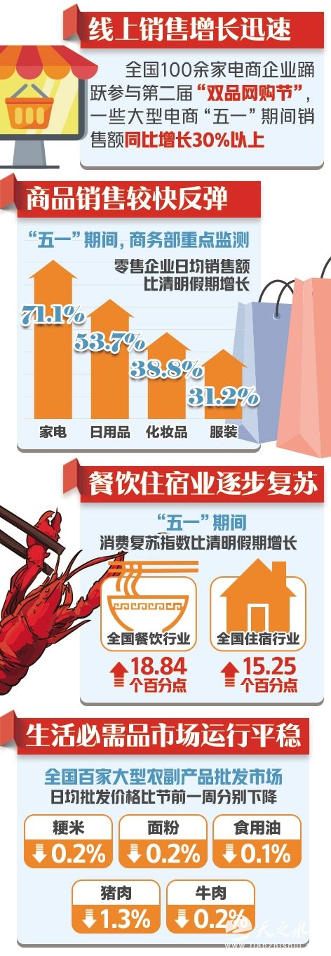 同时,商品销售较快反弹。“五一”期间,商务部重点监测零售企业家电、日用品、化妆品、服装日均销售额比清明假期分别增长71.1%、53.7%、38.8%和31.2%。