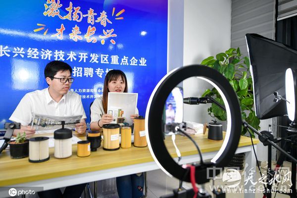 5月11日,浙江省湖州市长兴经济技术开发区重点企业招聘专场,主播正在通过图片介绍企业工作环境。(图片来源:东方IC)