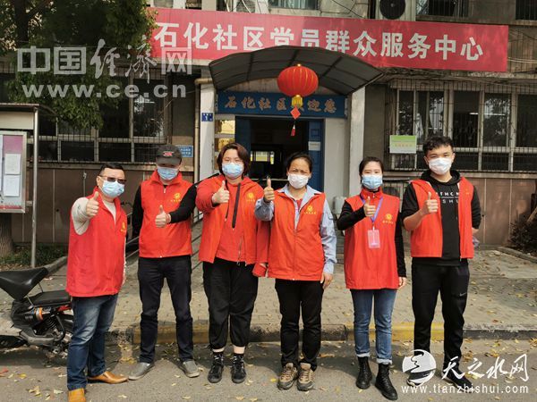 3月23日,部分志愿者在武汉市青山区青山镇街的石化社区党员群众服务中心门前合影。(中国经济网资料图 邓浩/摄)