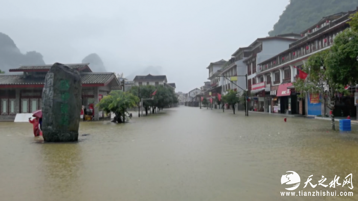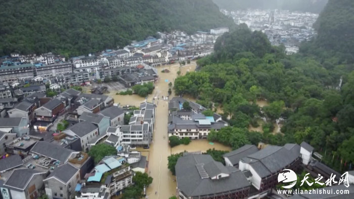 ↑连日来,受持续强降雨影响,广西桂林市阳朔县境内河水水位迅速上涨,阳朔县部分城区和周边多处村庄被淹。图片来源:央视财经