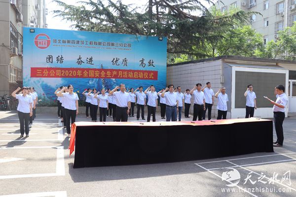 5月29日上午8点半,河北建工集团省四建三分公司2020年全国“安全生产月”启动仪式在机关院内举行,分公司班子成员及机关各科室40余人进行了安全宣誓和签名。6月份是全国第十九个“安全生产月”,本次活动主题为“消除事故隐患,筑牢安全防线”。