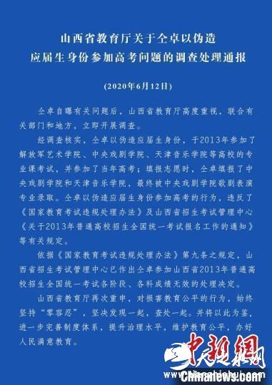 12日,山西省教育厅、山西省临汾市纪委监委分别发布通报,公布仝卓以伪造应届生身份参加高考等问题的调查情况,作出仝卓参加山西省2013年普通高校招生全国统一考试各阶段、各科成绩无效的处理决定,其继父仝天峰等多人被处分。