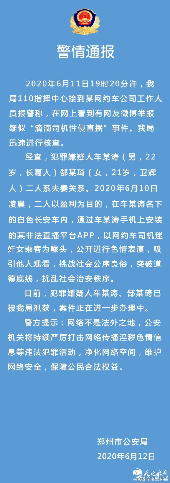 中新网6月12日电 河南郑州市公安局12日通过官方微博发布警情通报称,6月11日19时20分许,郑州市公安局110指挥中心接到某网约车公司工作人员报警称,在网上看到有网友微博举报疑似“滴滴司机性侵直播”事件。该局迅速进行核查。经查,两名犯罪嫌疑人系夫妻关系,目前已被抓获,案件正在进一步办理中。