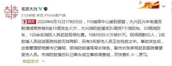 据北京大兴官方微博消息,6月12日17时05分,119指挥中心接到报警,大兴区兴丰街道百联清城商务楼B座19层发生火灾,大兴消防救援支队调派7个消防站、25辆消防车、120余名消防人员赶赴现场处置。