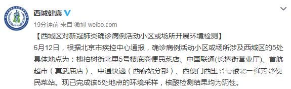 6月12日,根据北京市疾控中心通报,确诊病例活动小区或场所涉及西城区的5处具体地点为:槐柏树街北里5号楼底商便民菜店、中国联通(长椿街营业厅)、首航超市(真武庙店)、中通快递(西客站分部)、西便门西里11号楼北一栋芳邻便民菜站。现已完成该5处地点的环境采样,核酸检测结果均为阴性。