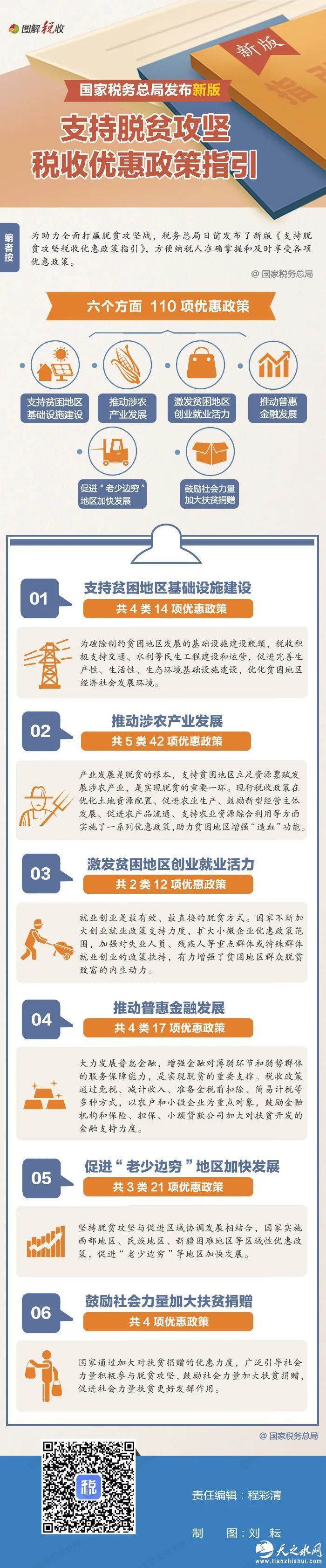 收好这张图!最新版支持脱贫攻坚的税收优惠政策都在这里了 2020-06-15 16:55 国家税务总局 我要评论0 为助力全面打赢脱贫攻坚战,税务总局日前发布了新版《支持脱贫攻坚税收优惠政策指引》(以下简称《指引》),梳理了110项推动脱贫攻坚的优惠政策。《指引》包含哪些内容?一图带你了解↓ 点击“阅读原文”查看《指引》全文 微笑 流汗 难过 羡慕 愤怒 流泪 相关阅读 关键词: 源头 病毒 调查 吴尊友 复制网址 打印 收藏 0