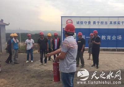 项目部即将进行垫层混凝土浇筑施工,现场有大量的木模板、油漆等易燃品,随着气温越来越高,火灾隐患随之增大。项目部结合现场实际组织了本次消防演练,演练分为消防知识培训和火灾事故演练两部分。演练前项目经理李宏伟通报了温岭槽罐车爆炸事故造成的严重后果,阐明本次演练的目的和意义。随后项目部安全员王东春对灭火常识、火灾逃生方法、灭火器如何使用等进行了讲解,并演示了手提式干粉灭火器的具体使用方法,参与演练的人员亲自体验了灭火器的使用。